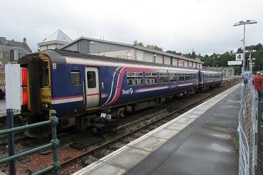 We move inland again and there are more fields in the scenery. We start to descend quite sharply and the train speeds up to around 60mph as the driver tries to make up time. Houses appear in larger numbers now, though there are still plenty of trees around the track. You can also see house on the hill opposite us and then the sea appears in the distance as we approach Oban. You can see the mountains of the island of Mull as the gap opens up. Then we enter a cutting and slow as two, then three tracks appear on the left. You see a ferry on the left and we slow as we come into Oban station. It is quite curved with just two platforms now with one siding next to it. There is a newish station building as well. The scheduled arrival time is 11.27, but we are still four minutes late. MC